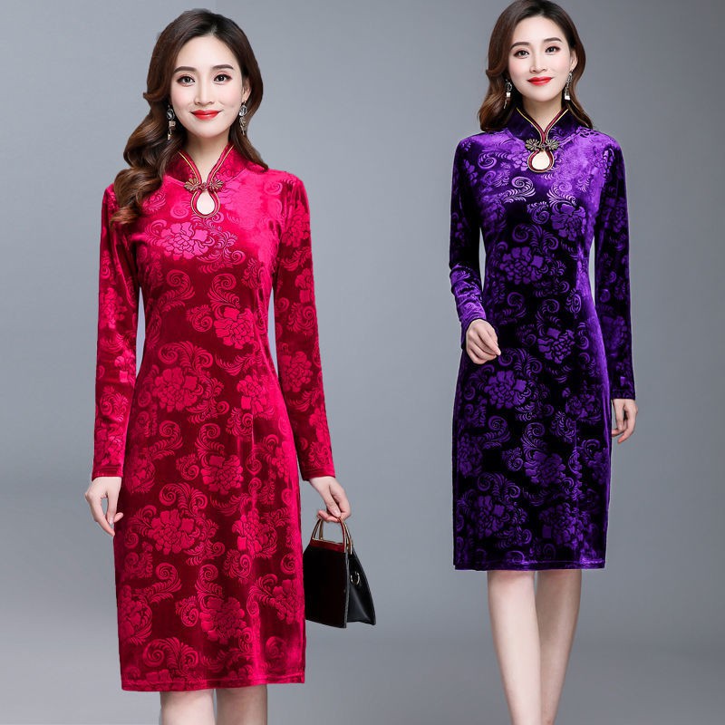 Autumn Long Sleeve Velvet Slim Cheongsam Vintage Xl 5xl Plus Size Women Party Dinner Wedding Midi Dresses Shopee Singapore